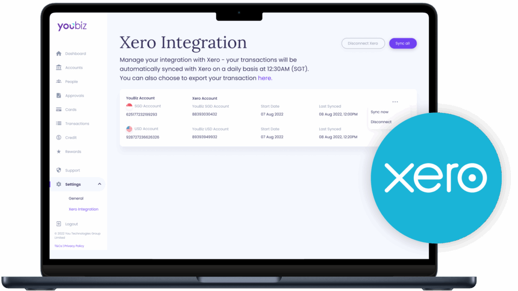 After you have successfully integrated your YouBiz account with Xero, transactions from all connected accounts will be automatically synced with Xero on a daily basis.