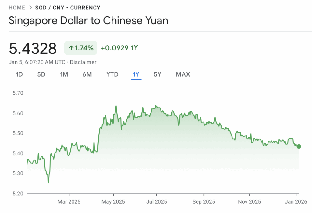 Current SGD to CNY rate (5 Jan 2026): 1 SGD = 5.43 CNY