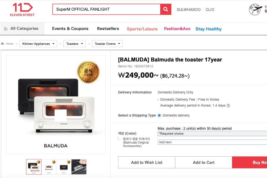 ถ้าอยากซื้อ Balmuda The Toaster ราคาถูกกว่าไทย ลองมาเปรียบเทียบราคาที่เว็บ 11street ของเกาหลีกันบ้าง คุณสามารถหาซื้อเครื่องอบขนมปังได้ในราคาเพียง 249,000 KRW หรือเป็นเงินไทย 6475.82 บาท แต่พอบวกกับค่าบริการชิปปิ้งอีกประมาณ 2,000 บาท ถูกกว่าไทยประมาณ 2,000 บาท แต่ถ้าอยากได้ราคาประมาณนี้ต้องเลือกจ่ายเป็นสกุลเงินวอนและต้องใช้บัตร YouTrip เท่านั้นนะ